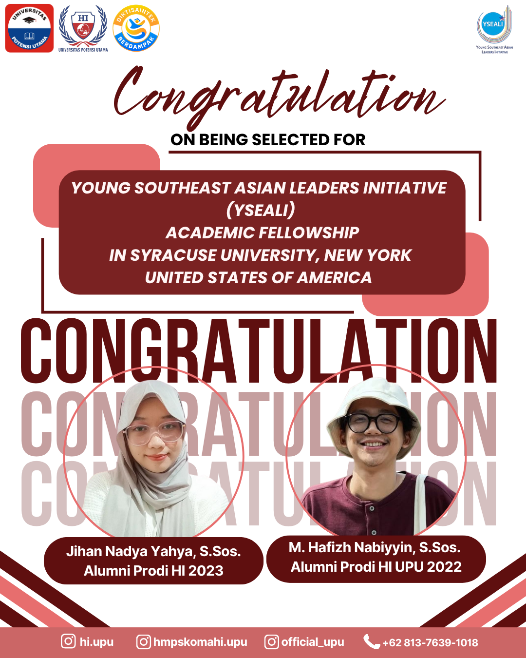 Medan, 1 Oktober 2025. Program Studi Hubungan Internasional Universitas Potensi Utama dengan penuh kebanggaan mengumumkan bahwa Jihan Nadya Yahya, S.Sos. (HI UPU 2020) dan M. Hafizh Nabiyyin, S.Sos. (HI UPU 2019) — dua alumni Program Studi Hubungan Internasional Universitas Potensi Utama yang telah terpilih sebagai peserta dalam Young Southeast Asian Leaders Initiative (YSEALI) Academic Fellowship 2025 yang diselenggarakan di Syracuse University, New York, Amerika Serikat.